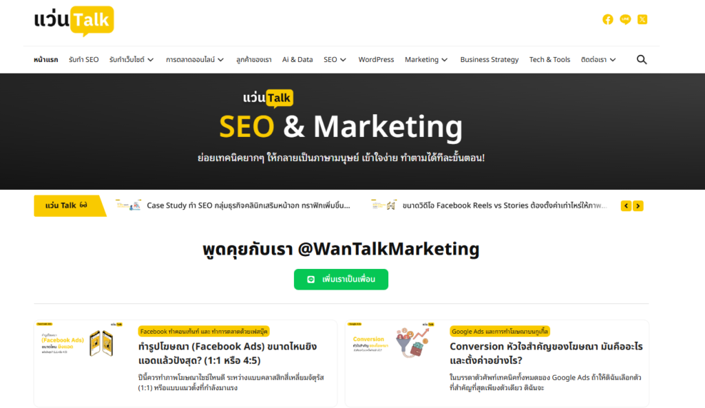 น้องใหม่ในวงการการตลาดออนไลน์ภายใต้สโลแกน “คุยเรื่องการตลาดออนไลน์ ให้เป็นเรื่องง่าย และได้ผลลัพธ์จริง”เป้าหมายสำคัญของ WanTalkMarketing.com คือการมอง SEO เป็นส่วนหนึ่งของภาพรวมการตลาดเพื่อสร้างความน่าเชื่อถือให้กับแบรนด์ในระยะยาวลดการพึ่งพาเทคนิคสายดำที่เสี่ยงต่อการถูกลดอันดับและสร้างการเติบโตของยอดขาย เปิดตัวแล้ววันนี้